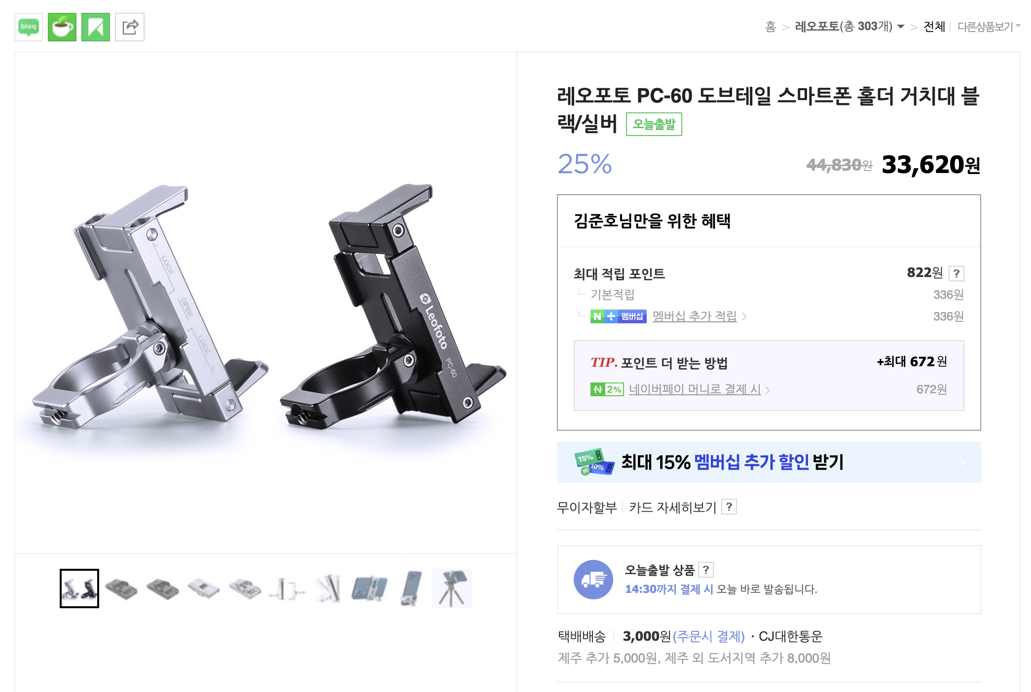 링크: https://smartstore.naver.com/bigboss_2021/products/6664294475레오포토 PC-60 도브테일 스마트폰 홀더 거치대 블랙/실버 : 빅보스