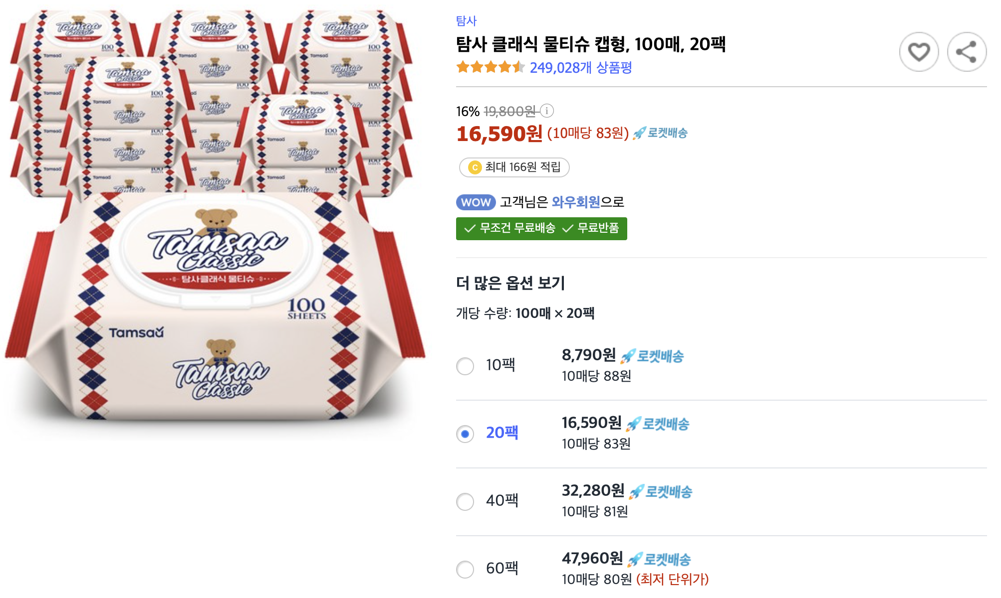 제품명: 탐사 클래식 물티슈 캡형 100매 20팩
