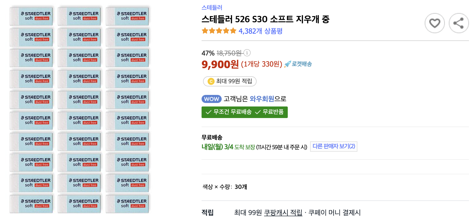 아직 사용하던 지우개가 남아 있어서 추가 구입은 하지 않았습니다. 예전에 구입했을 때 보다 오히려 더 저렴해진 것 같네요.
