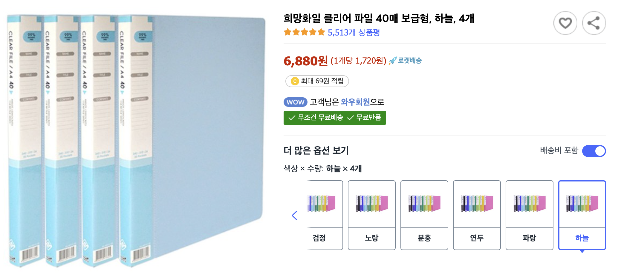 3학년 아이 준비물로 클리어파일 40매가 있네요. 당장 4개씩이나 필요할까 싶긴 한데 집에서도 종종 필요한 경우가 있어서 넉넉하게 주문했습니다.