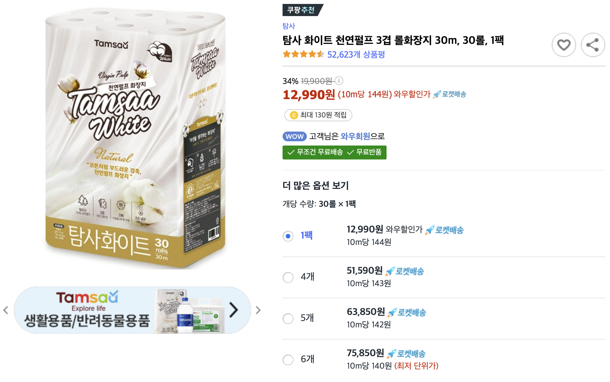 제품명: 탐사 화이트 천연펄프 3겹 롤화장지 30m