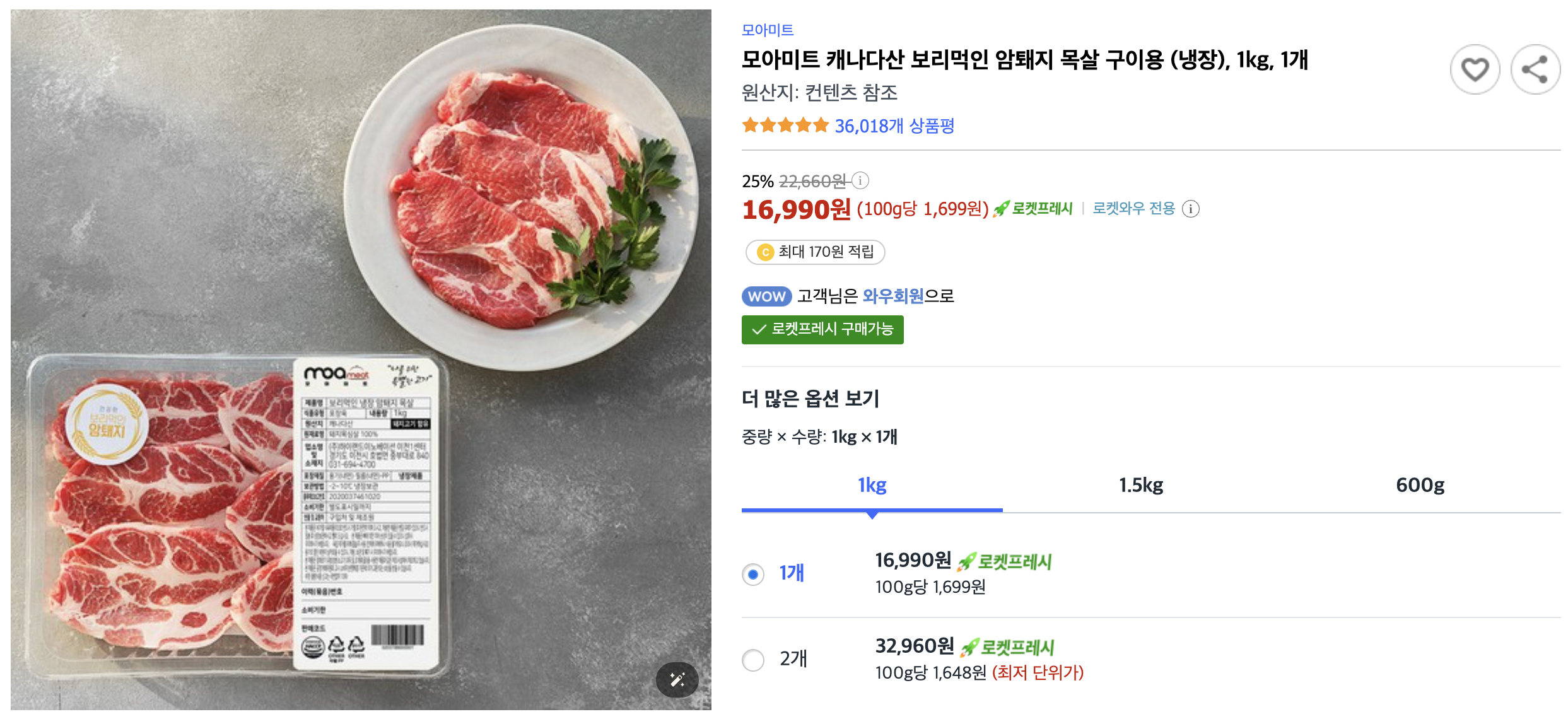 이마트트레이더스에서도 종종 사 먹는 캐나다산 보리먹인 암퇘지가 쿠팡에도 있네요. 이마트트레이더스에서 파는 것이 고기가 두툼하고 좋긴 한데 3kg 가까이 구입을 해야 되었습니다. 1kg씩 필요한 만큼 사 먹을 수 있어서 좋을 거 같습니다.