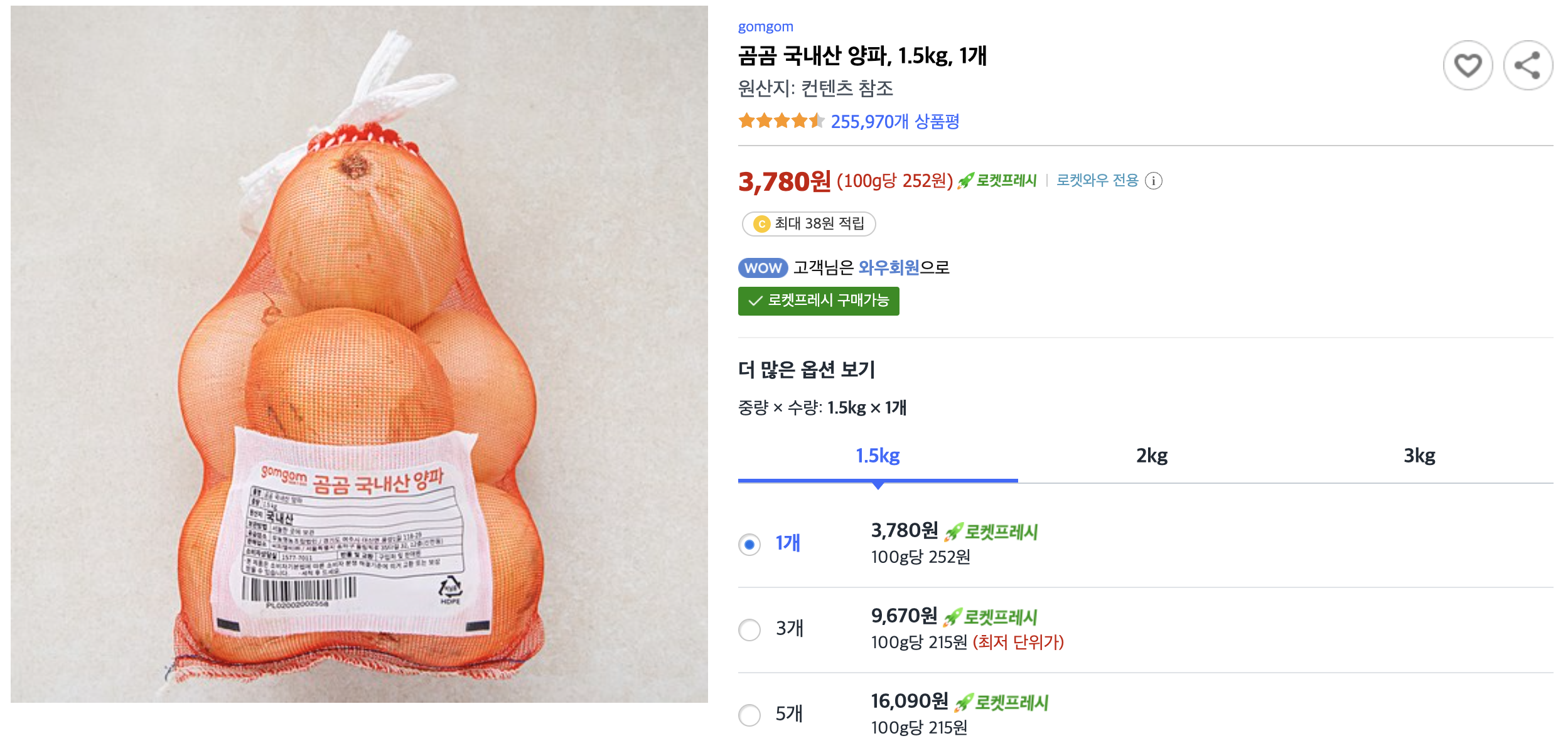가격: 2,800원 (100g당 280원)곰곰 국내산 양파, 1.5kg, 1개