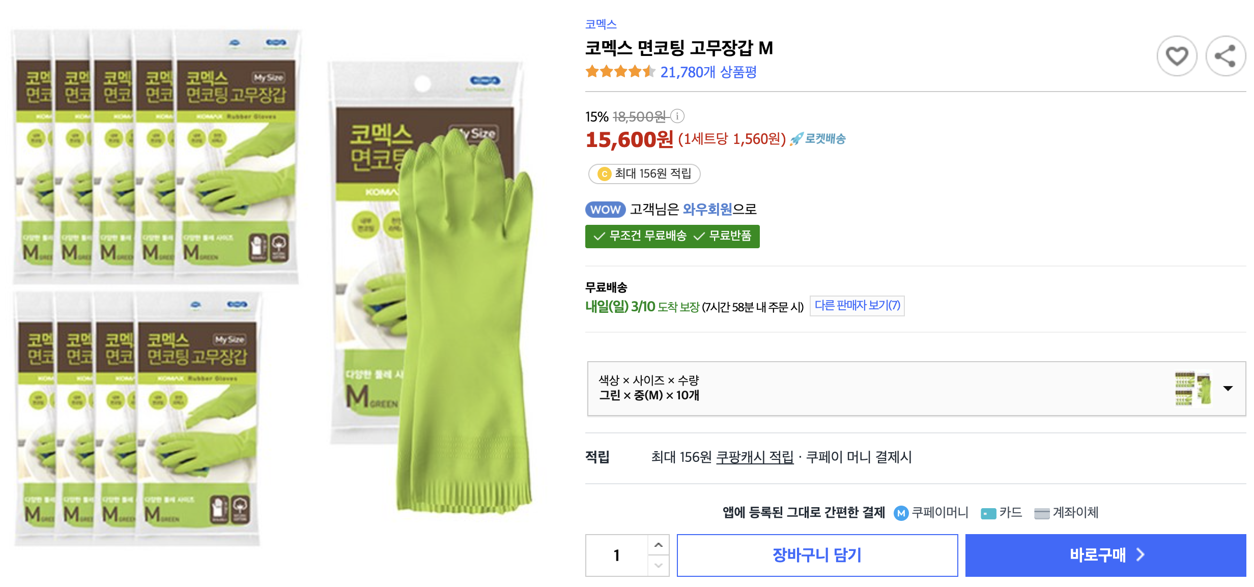 가격: 19,870원 (100ml당 922원)코멕스 면코팅 고무장갑 M