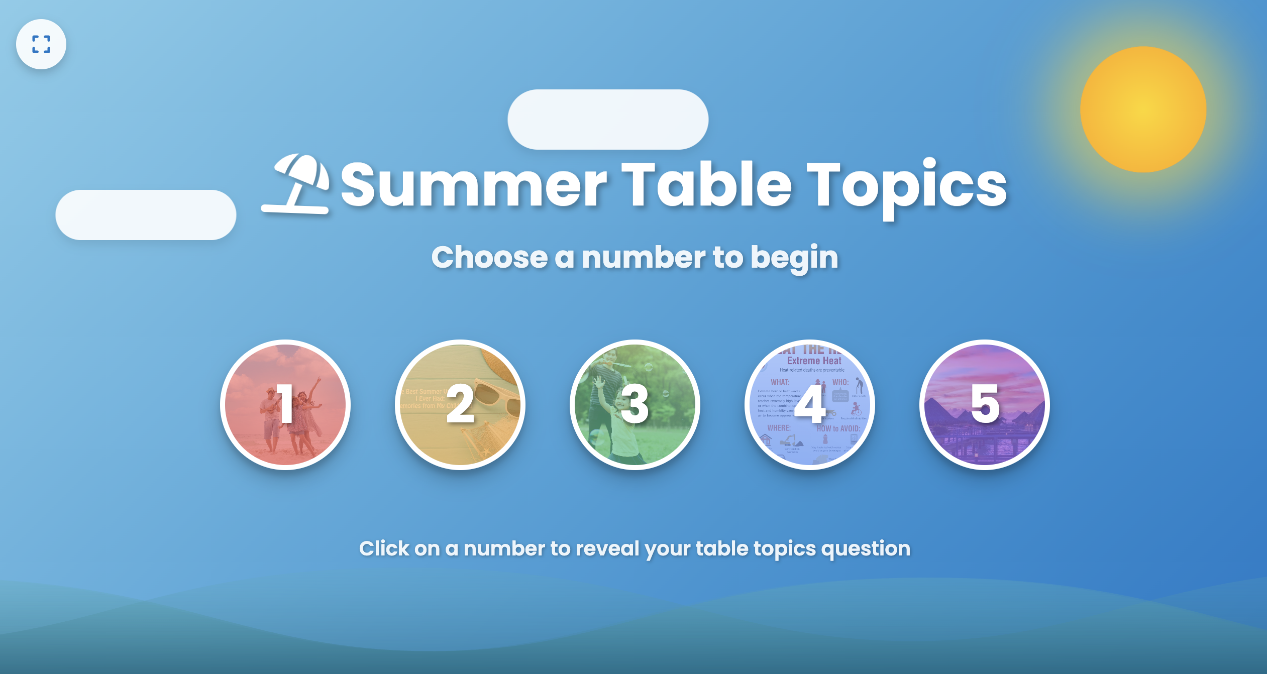 "I have 5 questions prepared for tonight, all about summer! Each is hidden behind a number from 1 to 5. Our speakers will choose a number, and I will reveal the question they will answer."
