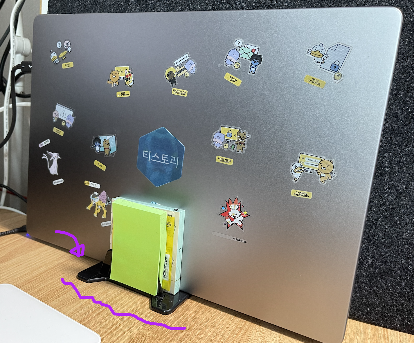 그런데 몇 가지 문제점이 있습니다. 일단 두께가 맞지 않아서 두께를 맞추기 위해 포스트잇을 끼워두고 사용하고 있습니다. 그리고 노트북이 무게가 좀 나가다 보니 균형을 잘 맞춰서 끼워두지 않으면 노트북이 쓰러집니다.