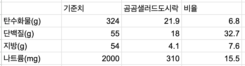 이 기준에 맞춰 샐러드 도시락의 "1일 영양성분 기준치에 대한 비율"이 맞는지 직접 계산해 보았습니다.
